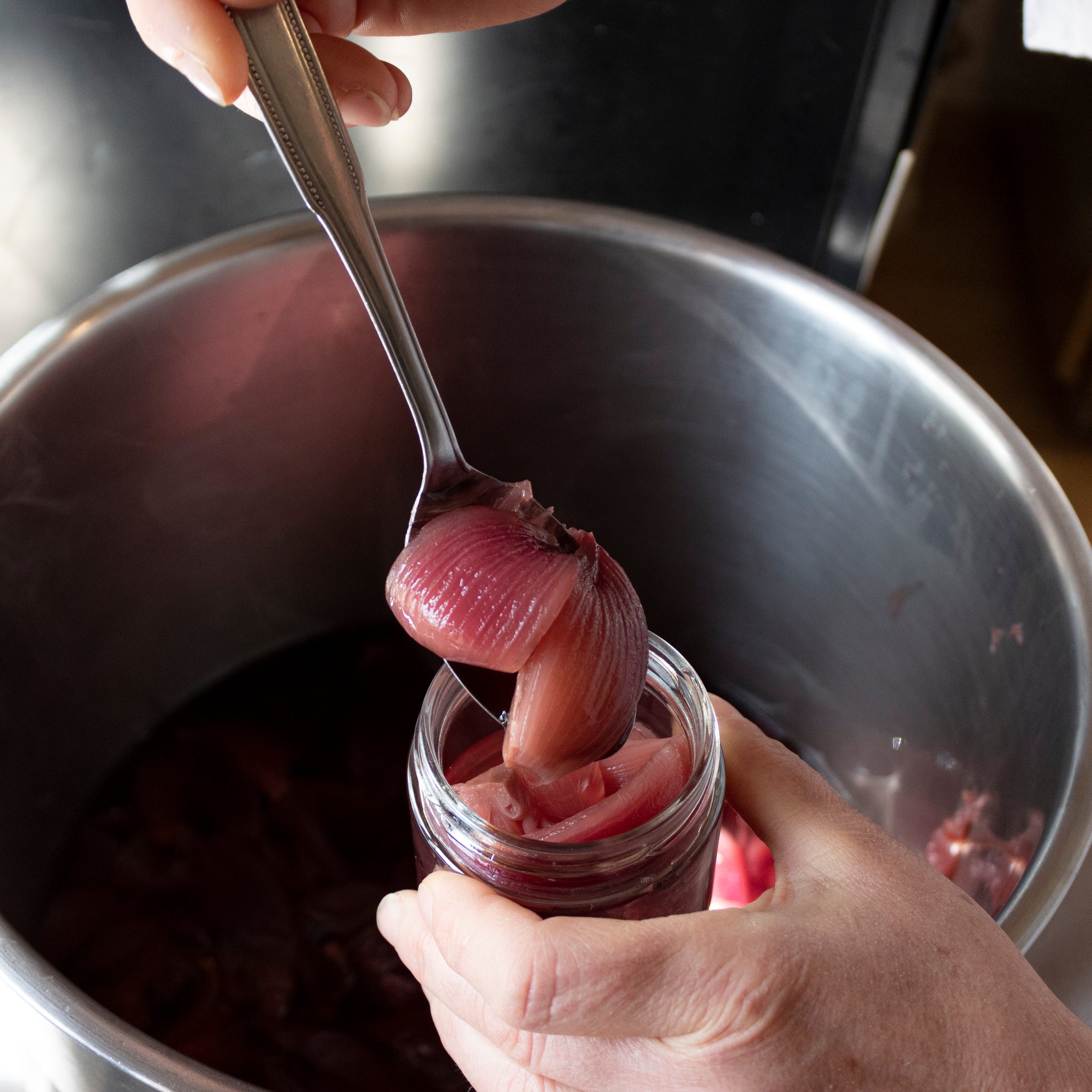 La parte interna della Cipolla Rossa, la più tenera e dolce, preparata in agrodolce, ingentilita con aceto di mele e sale dolce di Cervia e leggermente caramellata.